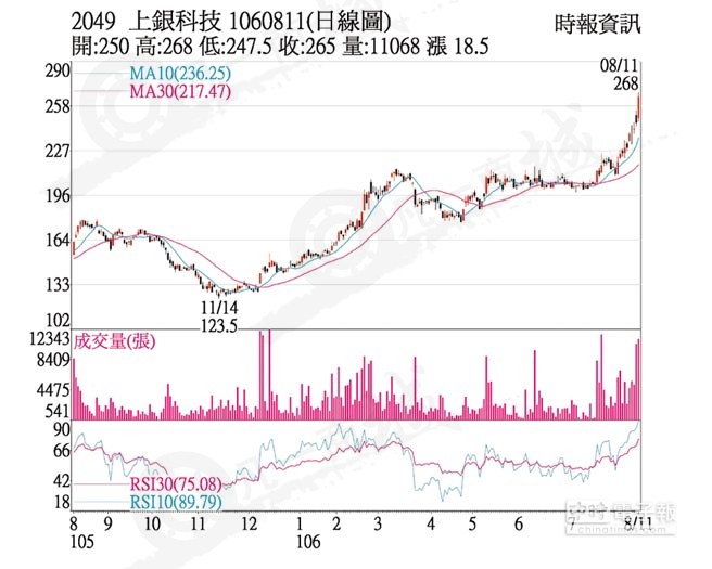 上銀科技(2049)7月合并營收,締造連續第5個月單月新高佳績,法說會報喜訊,明年首季訂單滿載,外資法人相繼調高目標價從235-315元不等,還調升評等至優于大盤,11日成交爆大量,開高走高,逆勢上漲18.5元以265元收盤,創2015年4月以來新高。