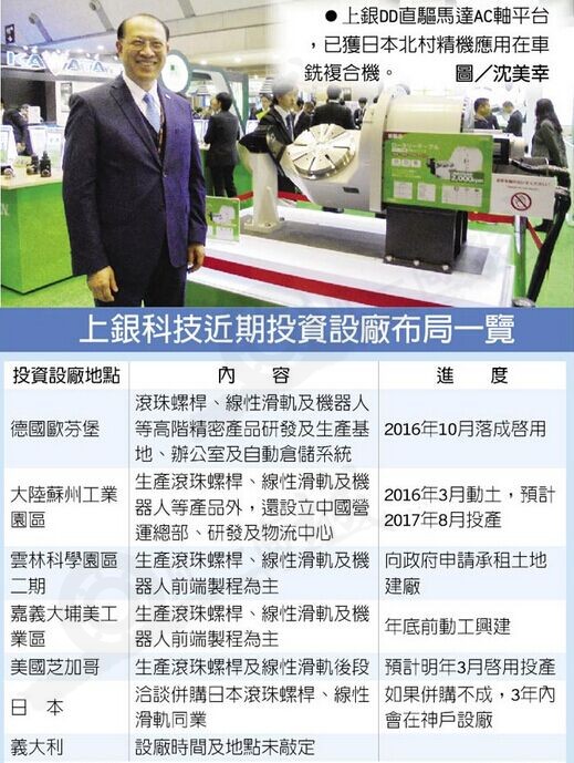 此外卓永財指出,上銀與多家日本生產滾珠絲桿、直線導軌等同業洽談,準備收購日本傳動系統廠商,如并購不成,計畫3年內于神戶設廠。