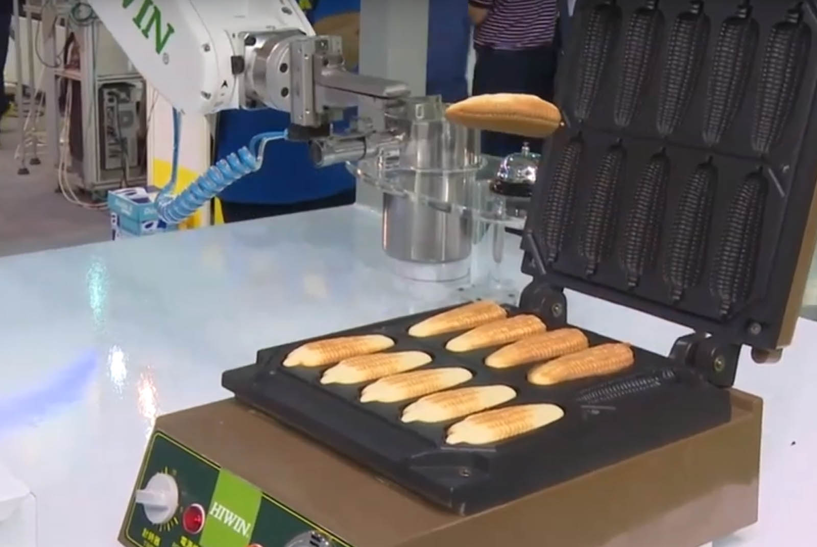 同事每一個都瞪著眼睛看我,「嗅覺?怎么做?」我說,「讓機器人煎雞蛋糕,不就有香味了?」有香味就會把人吸引到攤位來,大家就瘋狂大笑。這不就需要一點幽默?當天晚上他們就買了做雞蛋糕的設備,當時離展覽只有幾天,還是做出來一個煎雞蛋糕機器人。之后又陸續做出了飲料自動服務、自動咖啡機。自動咖啡機原本只是展示,后來臺灣、中國、韓國許多大型連鎖跟咖啡制造場來談,現在也賣了很多臺。比如2018年8八月,上銀跟匈牙利世界杯咖啡賽沖煮冠軍王策合作。六月開始發想,八月就要做出來。
