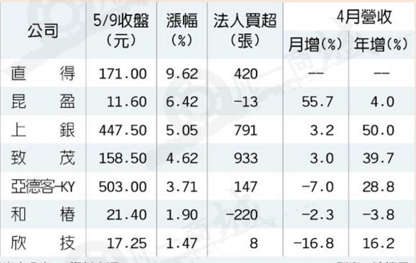 直得科技是提供機(jī)器人直線導(dǎo)軌、線性馬達(dá)等關(guān)鍵零組件的工具機(jī)廠,雖尚未公布4月?tīng)I(yíng)收,然3月?tīng)I(yíng)收創(chuàng)下歷史新高,第一季營(yíng)收年增近1倍,法人樂(lè)估,今年?duì)I收看增3成,每股盈余挑戰(zhàn)6元,三大法人昨日反手轉(zhuǎn)買420張,收復(fù)5、10日均線。