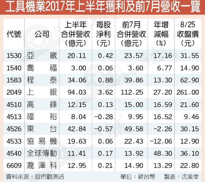 工具機接單持續(xù)好轉(zhuǎn),反映在下半年及獲利上,亞崴、程泰、上銀科技(hiwin)及東臺等大廠訂單能見度雖看到年底甚至明年首季,仍以集團型態(tài)參加9月18日在德國漢諾威登場兩年一度歐洲工具機展爭取訂單,增添營運動能。