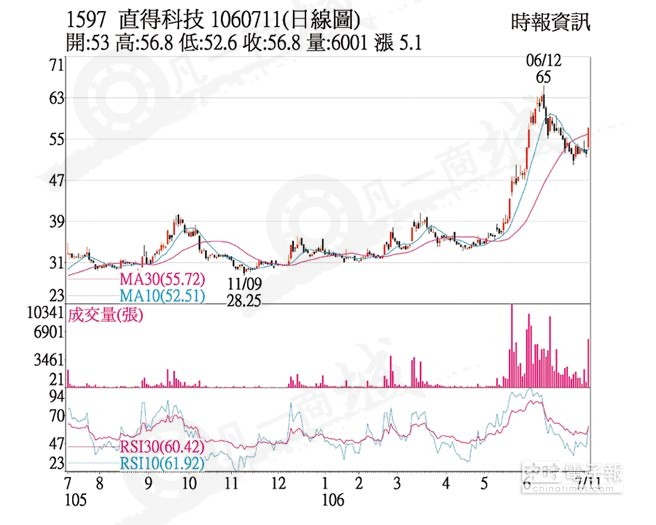 直得科技(1597)獲大和證遴選為臺灣機器人概念股之一,法人預期今年隨景氣好轉、拓展業務有成,直得營收會比去年兩位數成長,在外資及自營商聯手買超下,昨日成交爆大量,收盤前股價推升至漲停56.8元,上漲5.1元作收,一舉收復周線、月線及季線反壓套牢區。