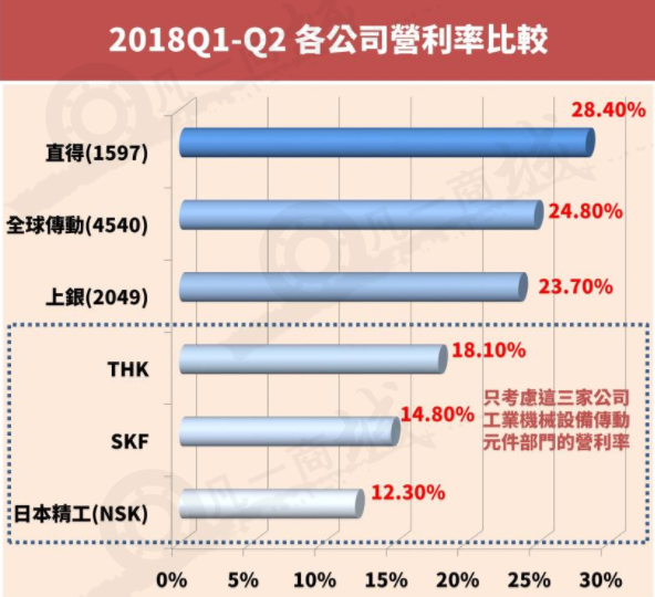 以和業(yè)務(wù)較專一的臺(tái)灣廠商做比較,結(jié)果發(fā)現(xiàn)在生產(chǎn)類似的產(chǎn)品上,臺(tái)灣廠商的營利率表現(xiàn)比 THK、NSK、SKF 還來的好。