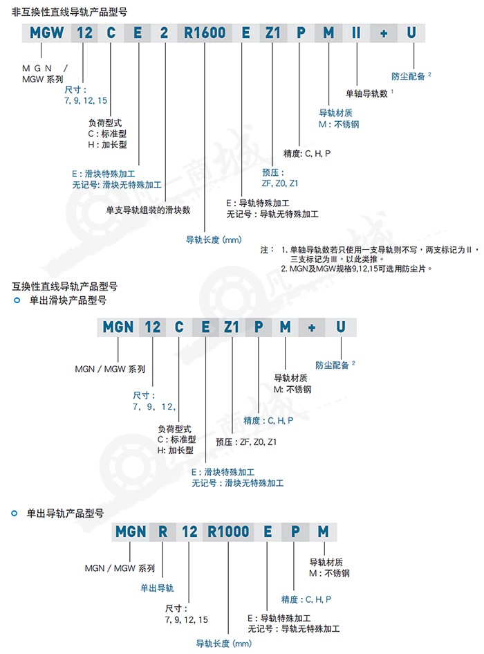 MGN 體積小、輕量化,特別適合小型化設備使用。 滑塊、導軌材質提供不銹鋼及合金鋼兩種。不銹鋼材質之直線導軌,包含滑塊、導軌及其它金屬配件如鋼珠、保持器等,皆使用不銹鋼材質,具備防銹的特性。 采用哥德型四點接觸設計,可承受各方向負荷,具備剛性強,精度高等特性。 有鋼珠保持器設計,在精度允許下具備互換性。